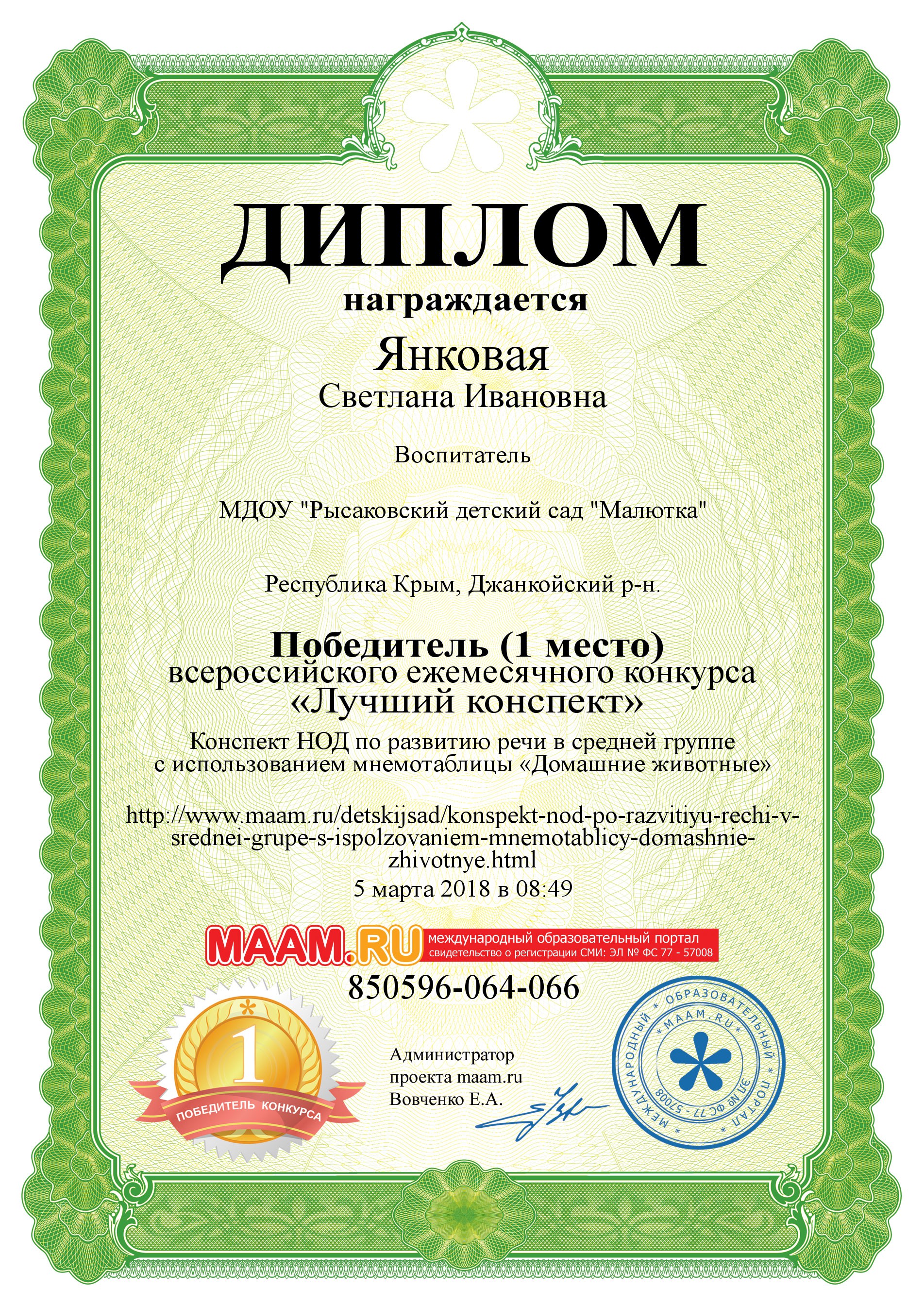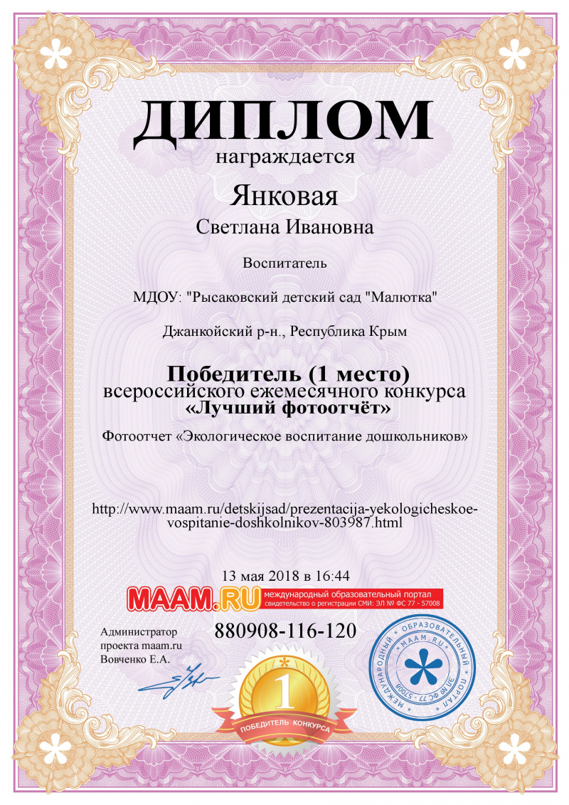 Воспитатель Янковая Светлана Ивановна